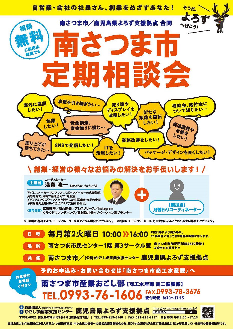 鹿児島県よろず支援拠点による「経営定期相談会」を原則として毎月第2火曜日に開催しております。