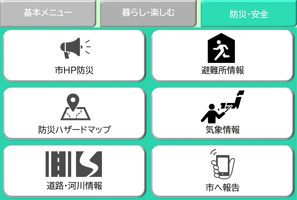 ●避難所情報 市内の避難所情報を確認できます。 ●防犯ハザードマップ 洪水や土砂災害、津波等による市内の危険区域を確認できます。 ●道路・河川情報 鹿児島県河川砂防情報システムにて雨量や水位情報、河川カメラ等を確認できます。 ●市へ報告 道路・河川・砂防、公共施設・公共トイレ、漏水等の情報を市へ連絡することができます。 |