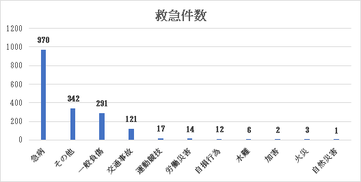急病970件、その他(転院搬送等)342件、次いで一般負傷291件、交通事故121件となっています。
