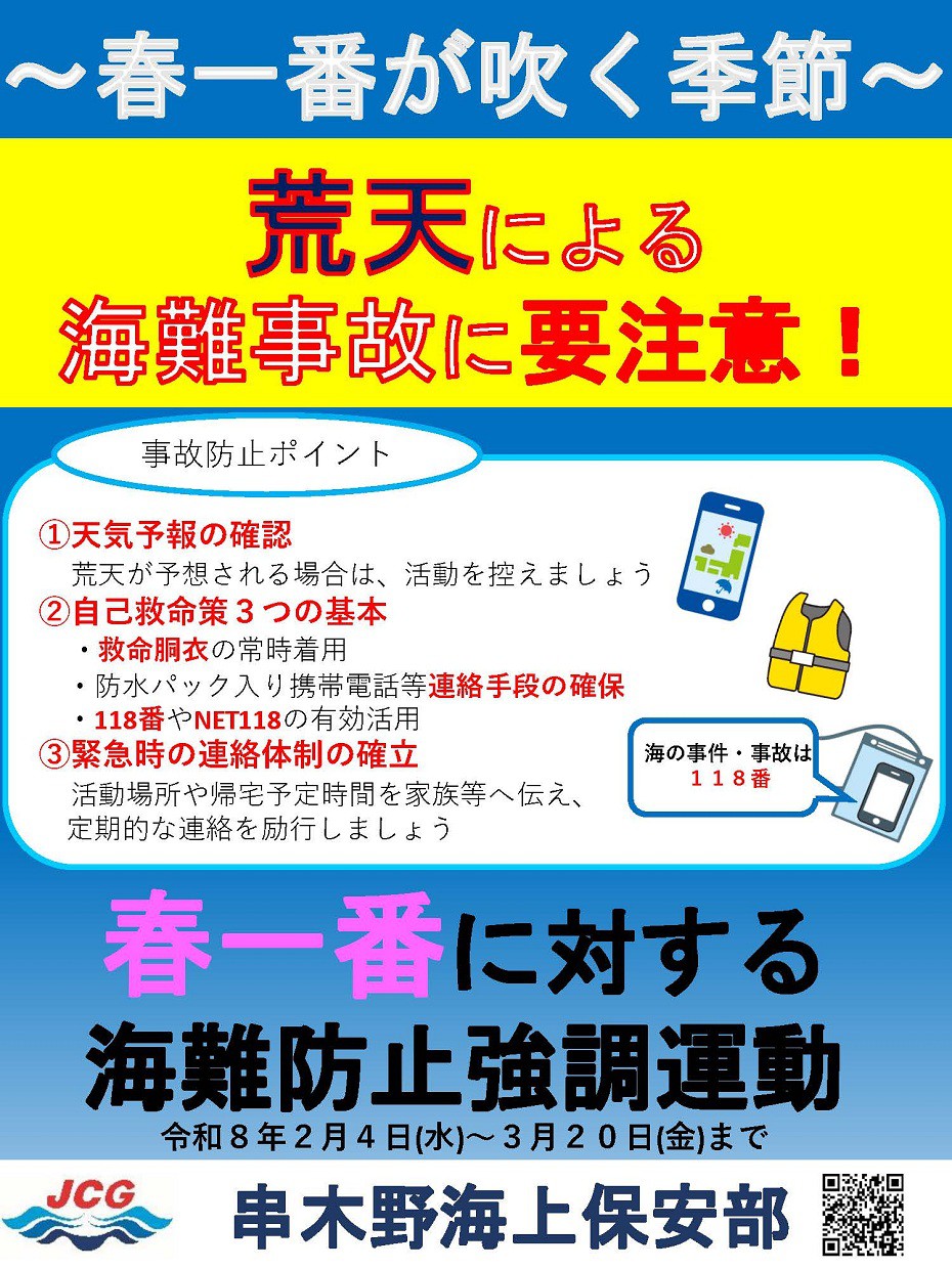 串木野海上保安部では、2月4日から3月20日の間、「春一番に対する海難防止強調運動」を実施しています。