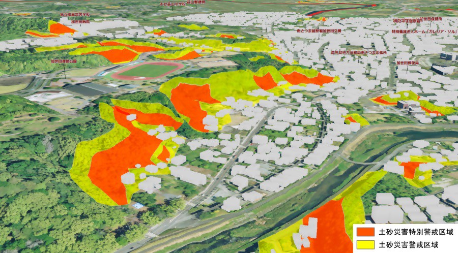 3D都市モデル(建築物と都市計画決定情報等)に洪水浸水想定区域や土砂災害警戒区域等を重ね合わせることで災害リスク情報を立体的に可視化しました。下記のPLATEAU VIEW 3.0で公開しています。