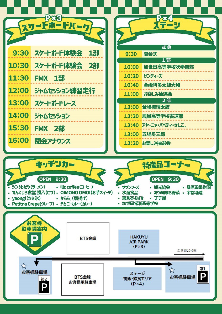令和5年7月に開設しましたスケートボードパーク「HAKUYU AIR PARK P×3」がこの度、改修工事を行い、進化した南九州最大級のスケートボードパークとして、リニューアルオープンいたします。リニューアルオープン当日は、FMXのバイクショーやスケートボードジャムセッション、地元団体によるステージショー、南さつま市特産品販売、キッチンカーの出店などご家族で楽しめるイベントを開催します。