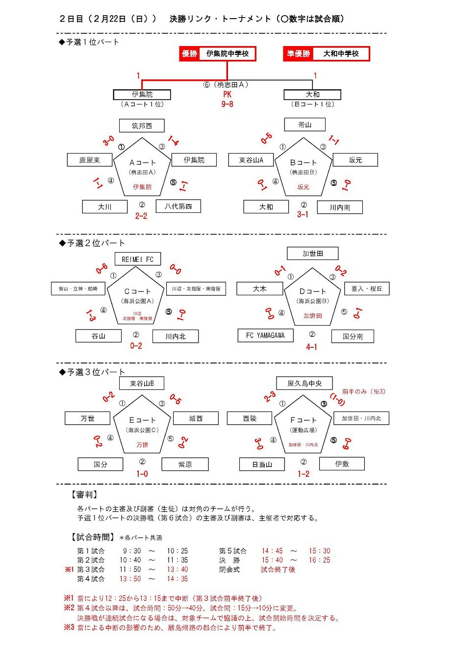Tweet ページ番号:E044195更新日:2026年3月 3日 13:57 「第29回南さつま市長旗争奪チェリーカップ中学生サッカー大会」が令和8年2月21日(土)・22日(日)の2日間、桷志田サッカー競技場(南さつま市人工芝サッカー場)、県立吹上浜海浜公園サッカー場・運動広場で開催されました。 結果は以下の通りです。 【優 勝】 伊集院中学校 (日置市) 【準優勝】 大和中学校 (福岡県柳川市) (個人賞) MVP 宮﨑(みやざき) 元理(げんすけ) (伊集院中学校) 優秀賞 大木(おおき) 蓮(れん)仁(と) (大和中学校) 敢闘賞 清水(しみず) 亜瑠人(あると) (加世田中学校) ※画像をクリックすると拡大します。