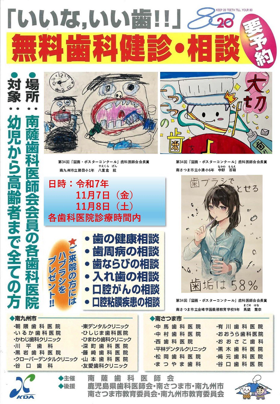 南薩歯科医師会では、「いいな,いい歯‼」無料歯科健診・相談を下記日程にて実施します。