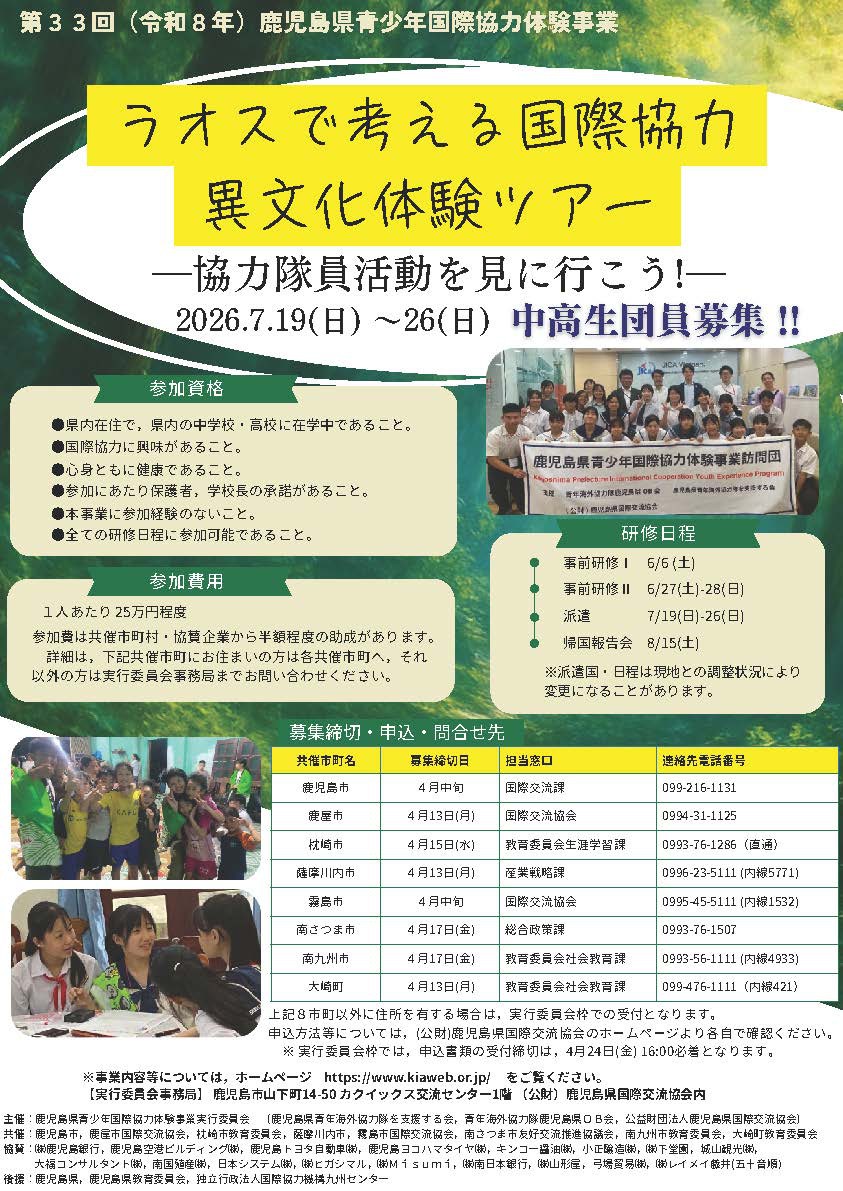 鹿児島県青少年国際協力体験事業は、開発途上国で「国づくり、人づくりに貢献する」青年海外協力隊の活動現場に鹿児島の青少年を派遣し、国際協力に対する理解を深めるとともに、ホームステイ等での異文化体験、学校等での現地学生との交流を通して、国際性豊かな人材育成を図ることを目的に平成3年から実施しています。