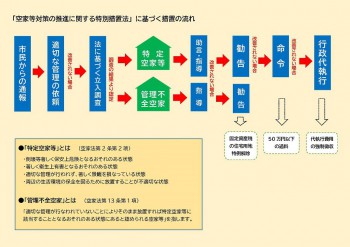 依頼を行っても改善されない場合は、次のとおり、「空家等対策の推進に関する特別措置法」に基づき、所有者に改善を求める対応を行っていくことになります。