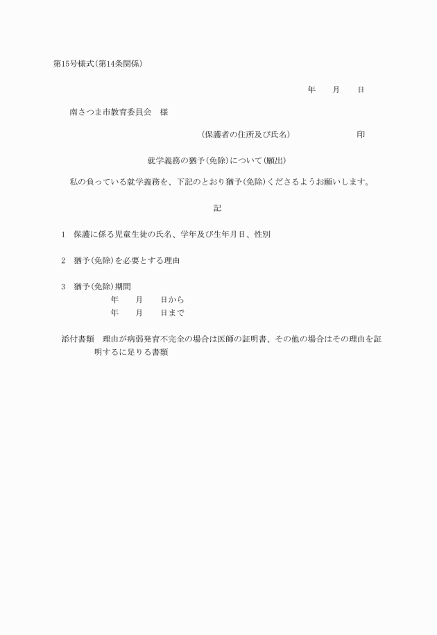 第14条 就学義務の猶予又は免除についての願出は、願書(第15号様式)をもってしなければならない。
