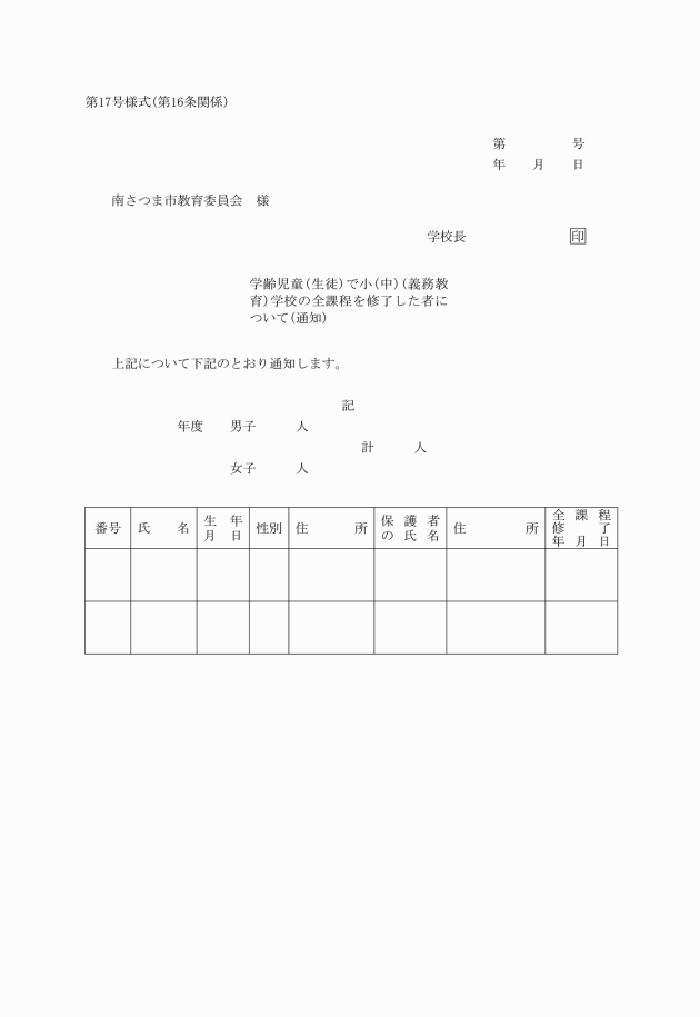 第16条 学校の全課程を修了した者の氏名の通知は、通知書(第17号様式)をもってしなければならない。