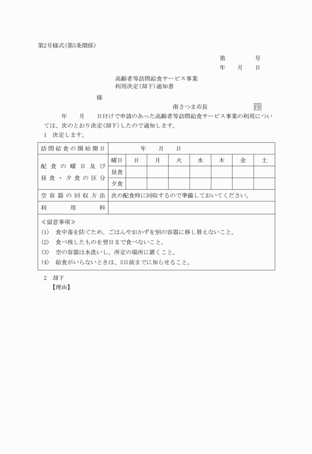 第5条 この事業の利用を希望する者は、市長に対し、高齢者等訪問給食サービス事業利用申請書(第1号様式)により申請する。