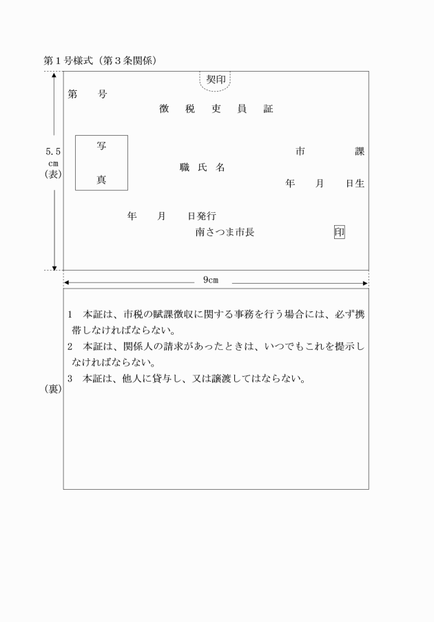 第5条 固定資産評価員及び固定資産評価補助員(以下「固定資産評価員等」という。)が携帯する証票の様式は、次に掲げる事項についてそれぞれ当該各号に定めるところによる。