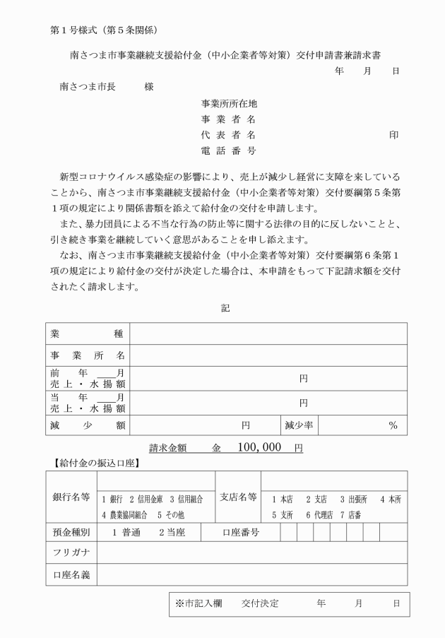 第5条 給付金の交付を受けようとする対象者(以下「申請者」という。)は、南さつま市事業継続支援給付金(中小企業者等対策)交付申請書兼請求書(第1号様式。以下「申請書」という。)に次に掲げる書類を添えて、市長に提出しなければならない。