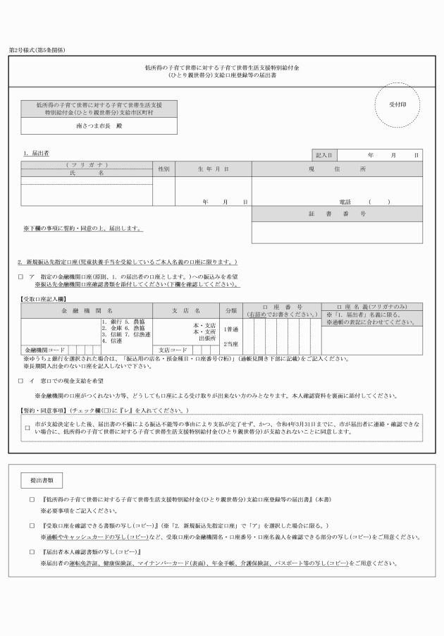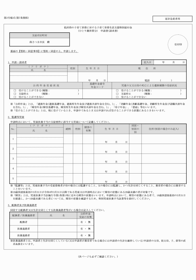 第7条 公的年金給付等受給者及び家計急変者に対する給付金(ひとり親世帯分)の支給を受けようとする者(以下「給付金(ひとり親世帯分)申請者」という。)は、低所得の子育て世帯に対する子育て世帯生活支援特別給付金(ひとり親世帯分)申請書(請求書)(第3号様式)(以下「給付金(ひとり親世帯分)申請書」という。)により申請を行う。