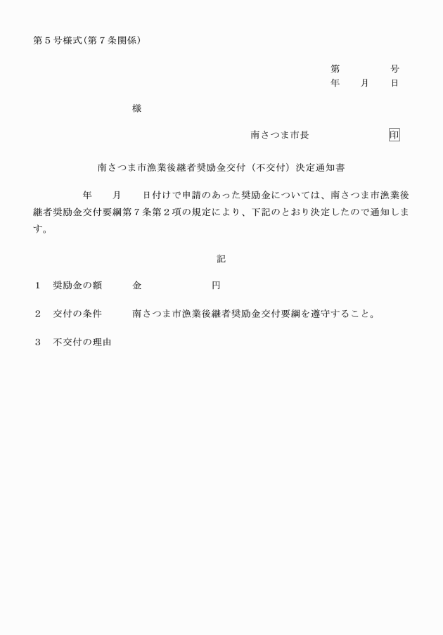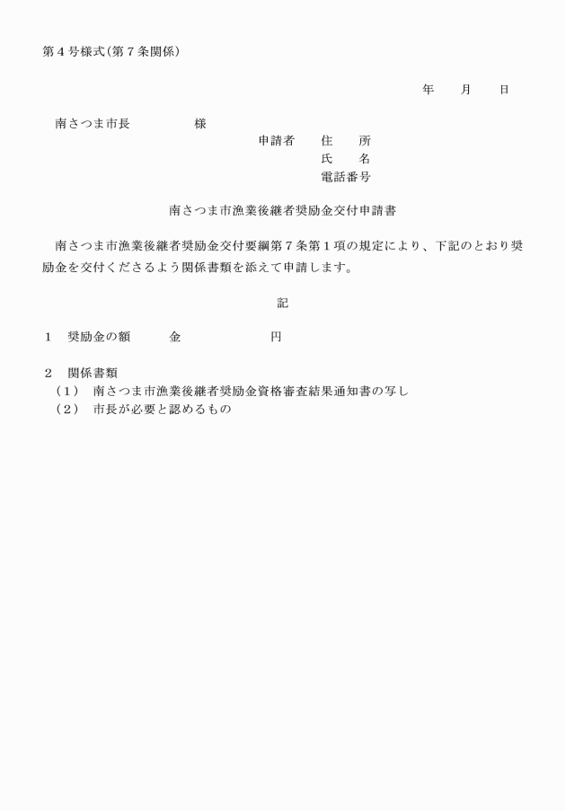 第5条 奨励金の交付要件の認定を受けようとする者は、南さつま市漁業後継者資格認定申請書(第1号様式)に関係書類を添えて、市長に提出しなければならない。