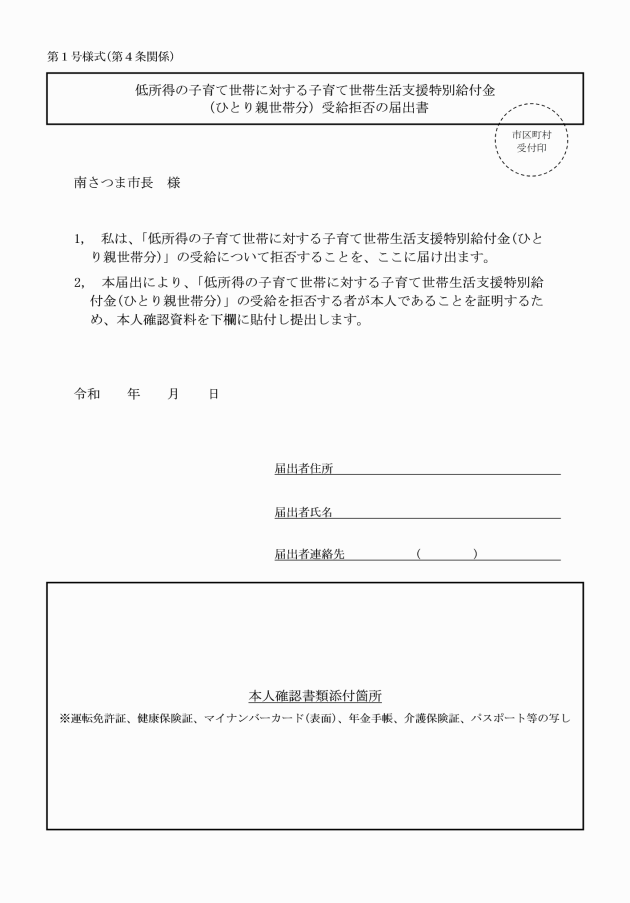 4 市長は、第1項の規定による申請の際、必要に応じて、公的身分証明書の写し等を提出させ、又は提示させること等により、当該給付金(ひとり親世帯分)申請者の本人確認を行う。