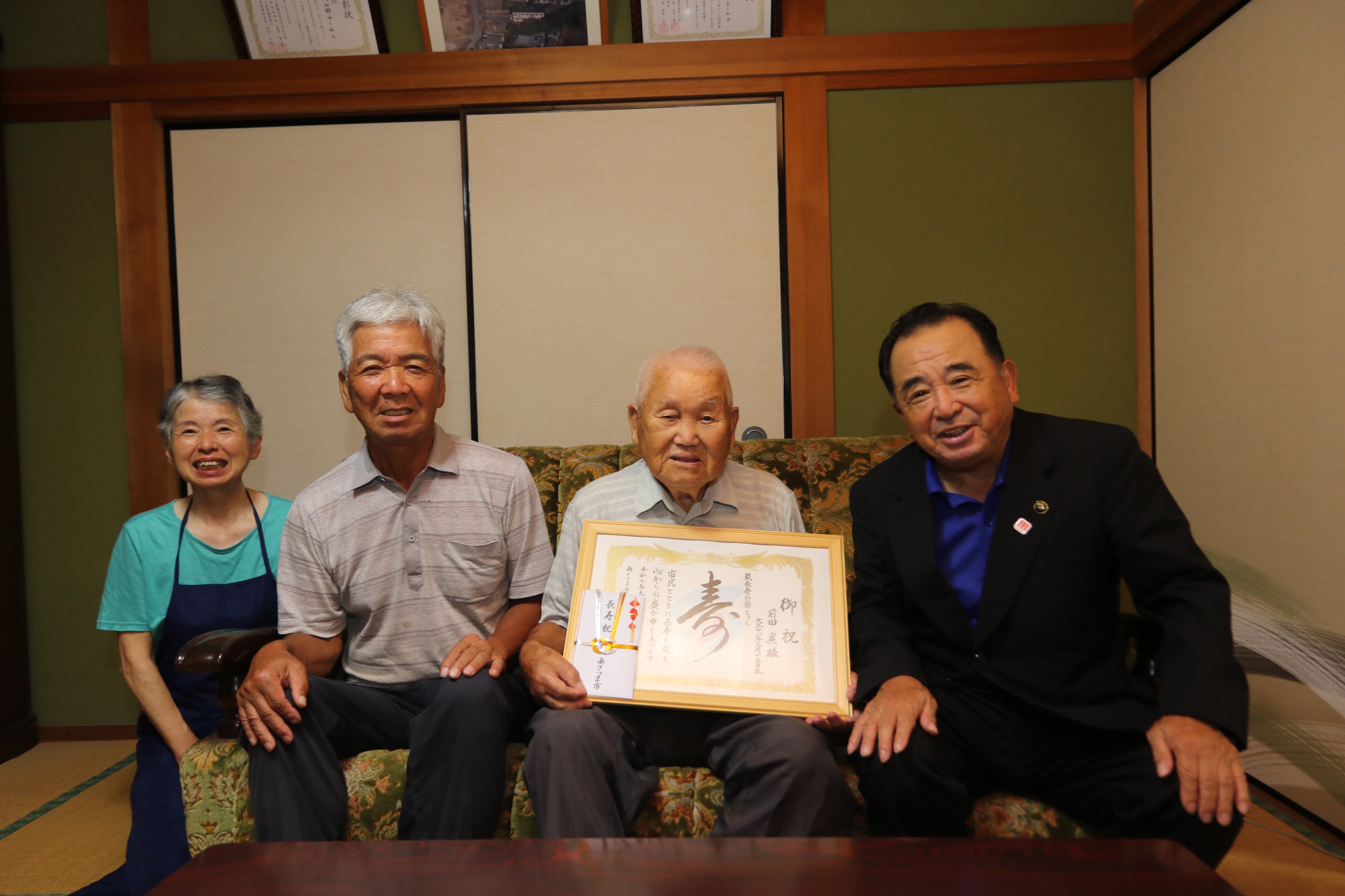Tweet ページ番号:E043823更新日:2025年11月 7日 21:45 今年度、市内の男性で最高齢となった、加世田内山田の前田廣さん(103歳)へ祝金を贈呈しました。これからもお元気で長生きされますよう願っています。 健康元気都市を目指す本市では、市内最高齢の男女に長寿の祝福と敬老の意を表し、長寿祝金を贈呈しています。