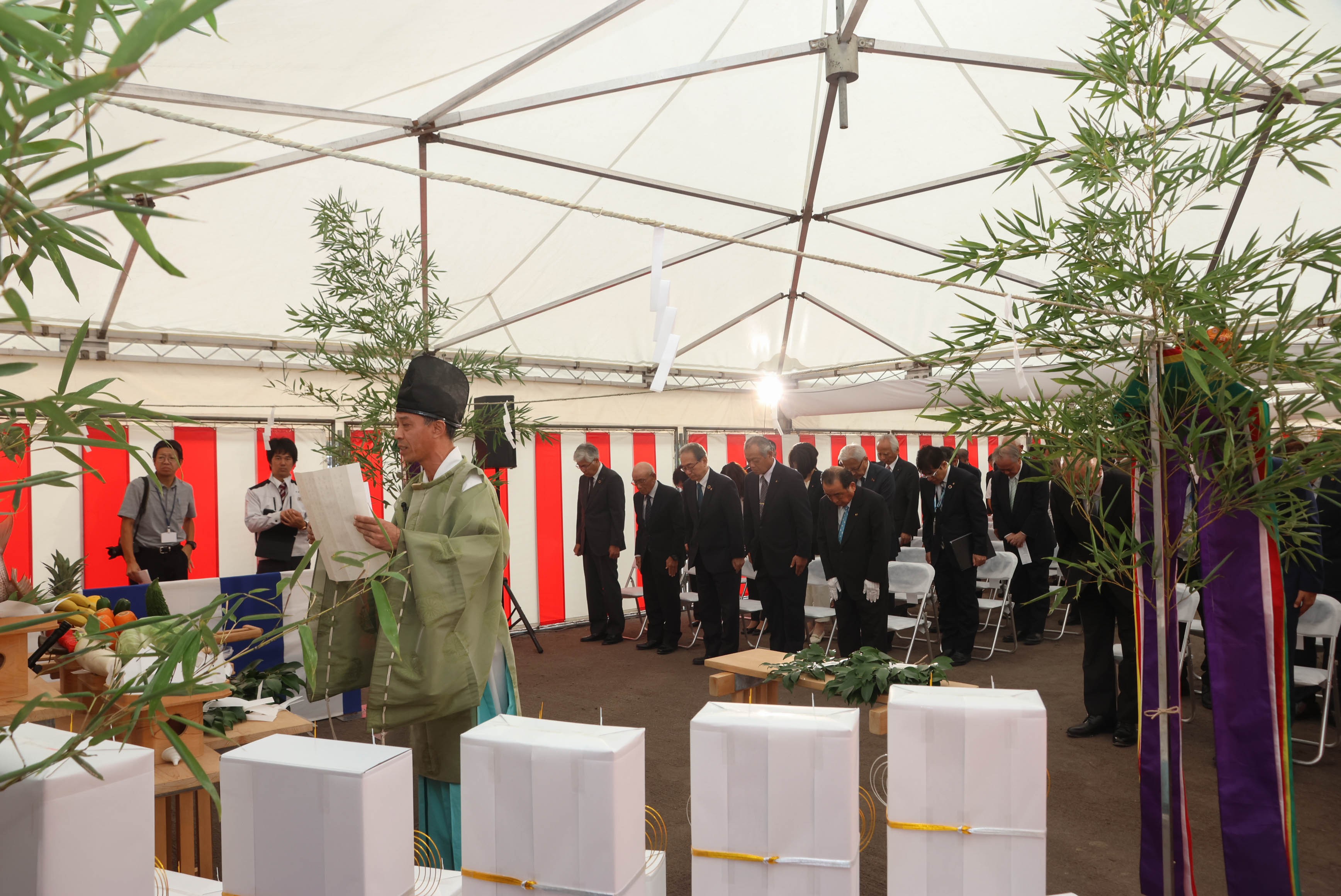 (仮称)教育行政棟新築工事における安全祈願祭が執り行われ、関係者約100人が参列し、新築工事の安全や円滑な進行を祈願しました。