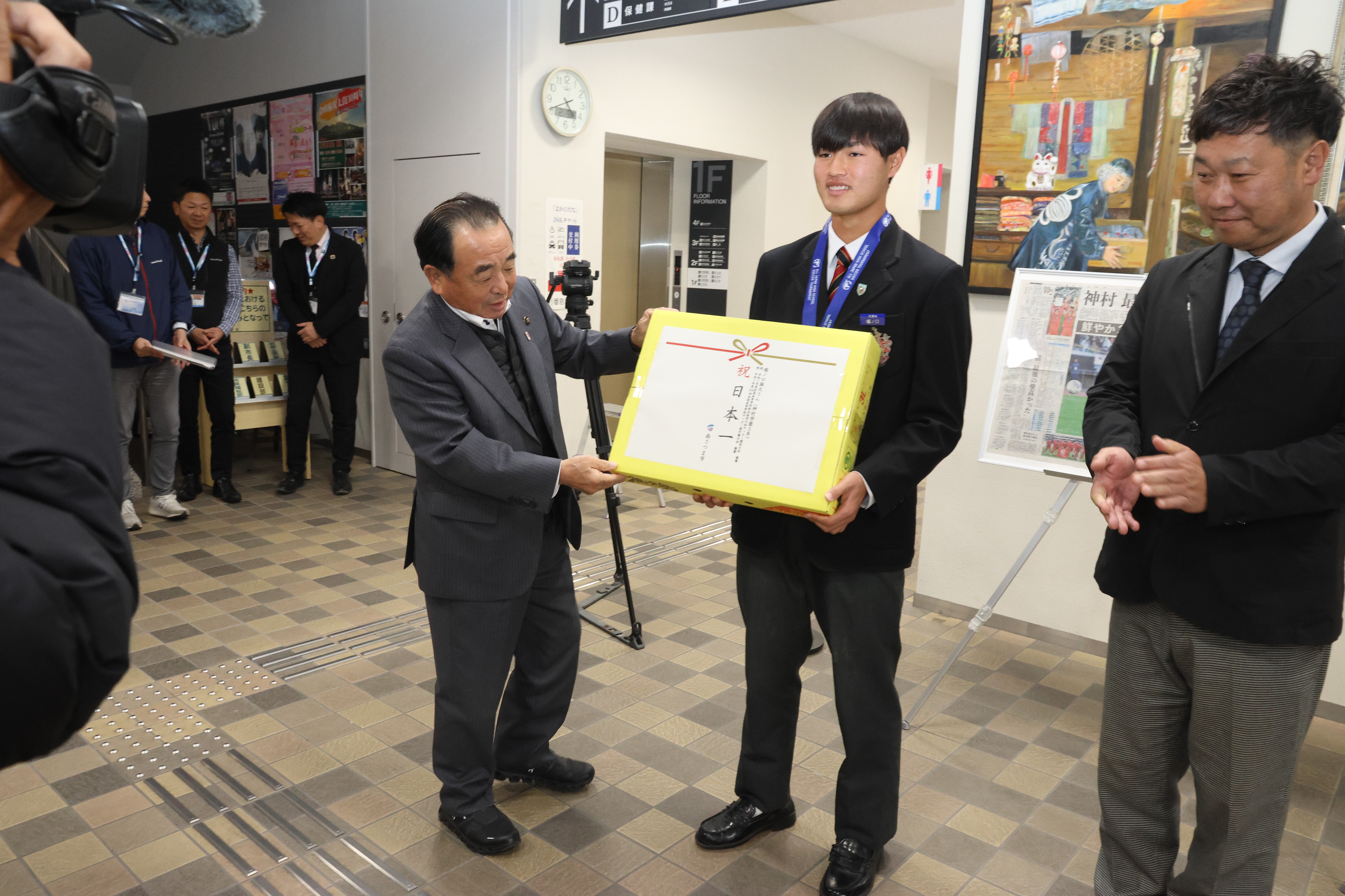 本市出身で神村学園高等部3年の堀ノ口瑛太さん(金峰町、田布施小出身)が、第104 回全国高等学校サッカー選手権大会にて県勢21大会ぶりの優勝報告に来ていただきました。神村学園サッカー部は昨年夏のインターハイに続き、全国大会夏冬2冠という偉業を果たされたこと、心からお祝い申し上げます。