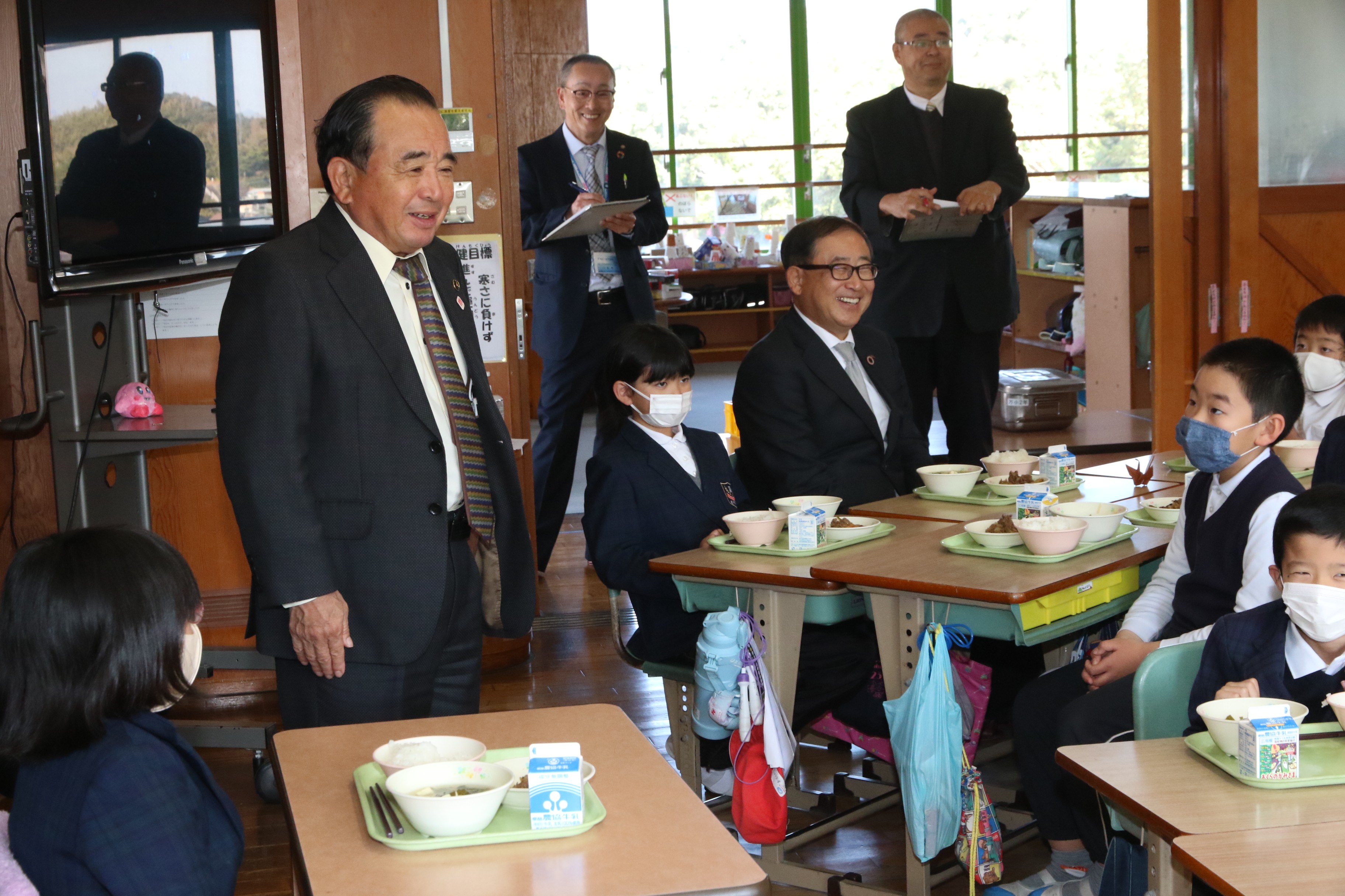 万世小学校で交流給食会が行われ、2年生の児童と一緒に給食をいただきました。